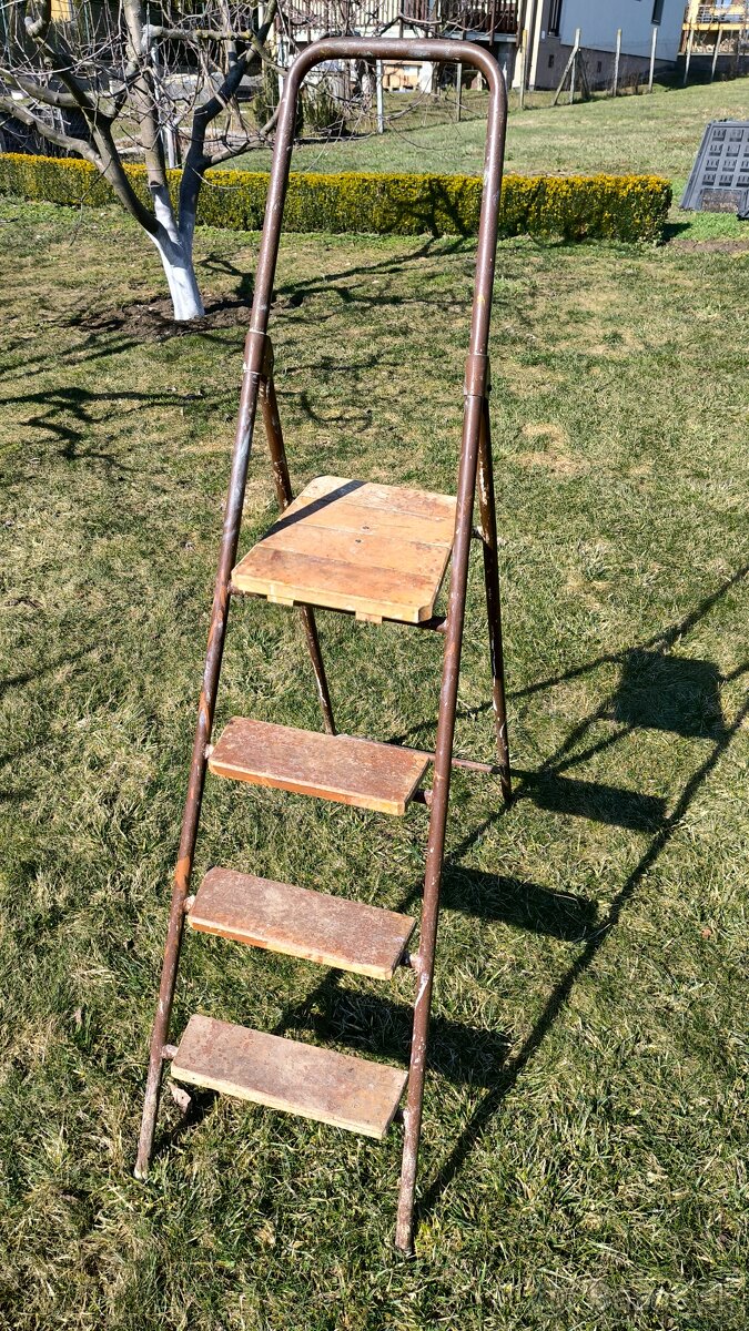 Rebrík oceľový, bytovy, dielenský. - [3.1. 2026]Predám poctivý železný rebrík ako na fotkach. Je to poctivý kus železa, s drevenými stupackami, skladací, po zložení nezaberá takmer žiadne miesto.