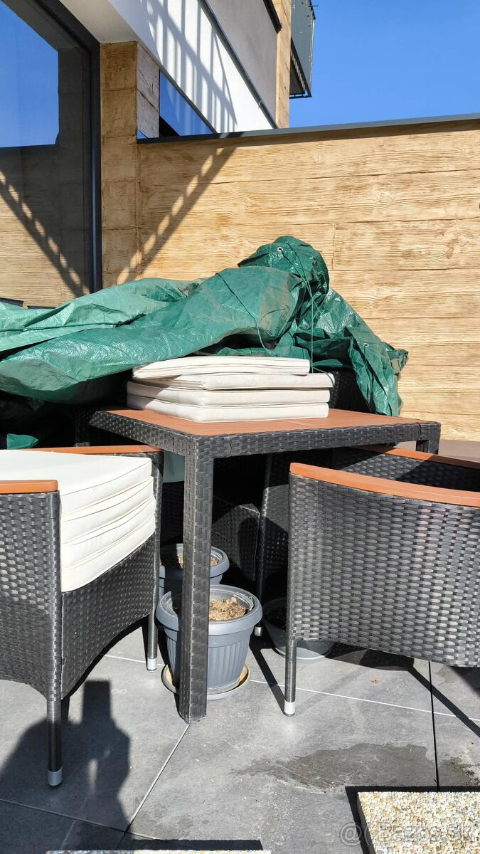 Predám ratanovè posedenie stôl a štyri stoličky s poduškami. Je v bezchybnom stave. Cez zimu je zakrytý plachtou, čiže nie je vystavený snehu ani mrazu.