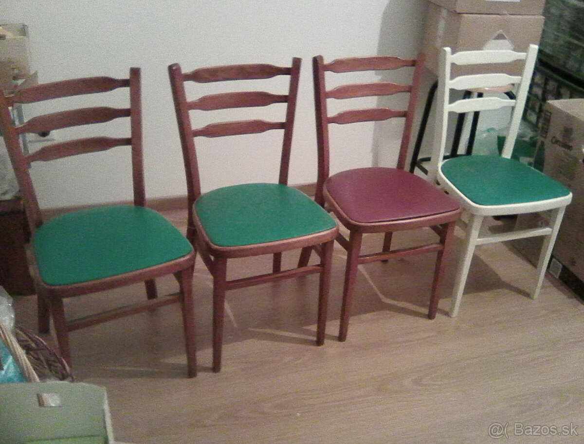 Predám 4 kusy stoličky z bukového dreva. Cena uvedená za kus. Na predaj 4 kusy. Hnedé stoličky majú zelené sedadlá a biela má hnedé sedadlo. Dunajská Lužná