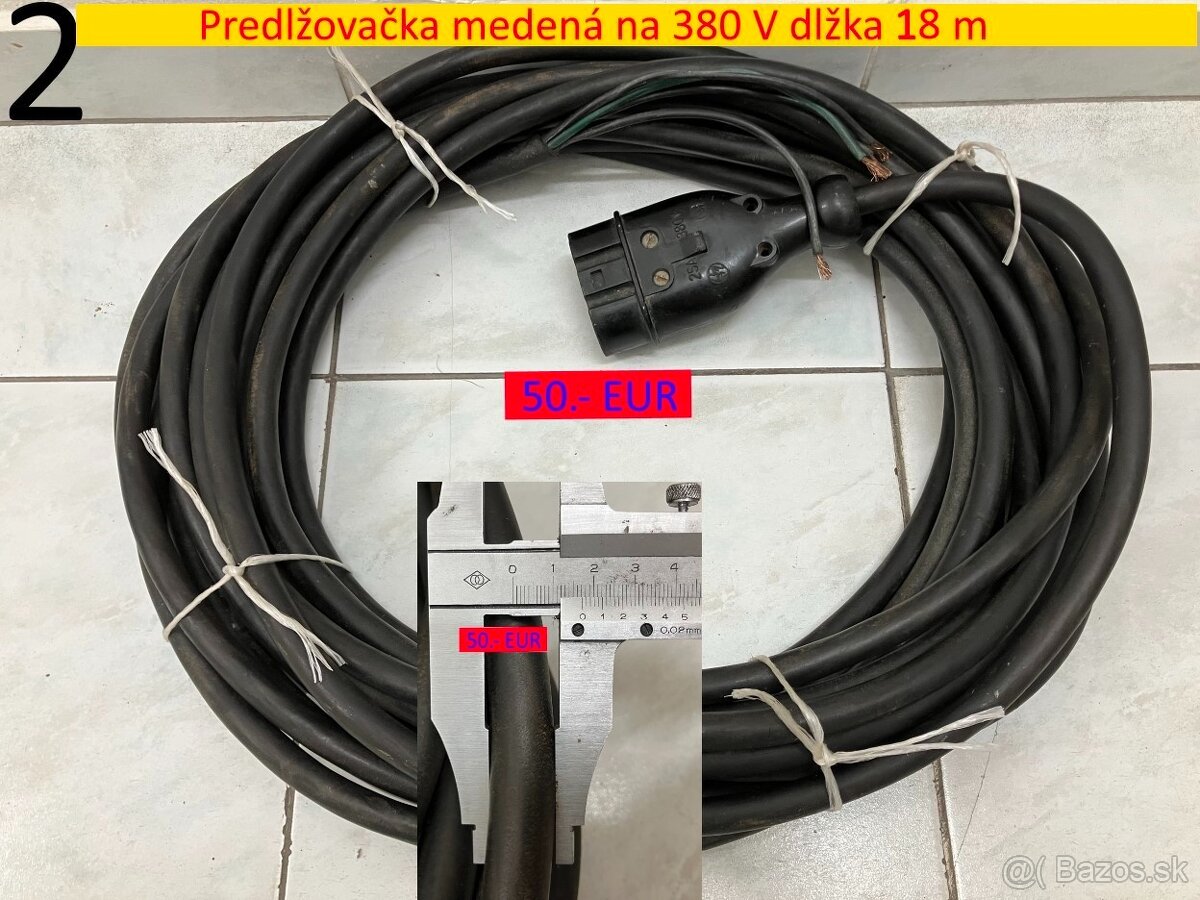 8 - medený 4 žilový predlžovací kábel gumový na 380V, pletená meď, s dlžkou 9,5 m, podľa priložených fotografií.