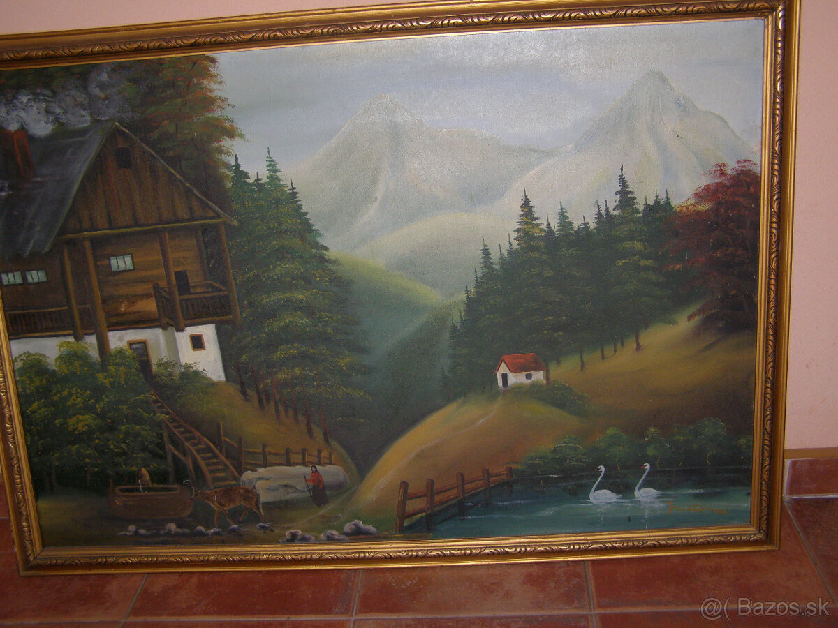 Obrazy 1-signovaný na plátne/chata/ r.1966 rozmer 104,5 x 72/cena 70e/.2/most/-rozmer 92 x 56/29e/,3-65,5 x 45-stromy so srnkou,plátno,signované/45e/,4-zimná krajina s chatou,rozmer 51,5 x 36,5/20e/,signovaný,5-štyri obrazy-4 ročné obdobia/jar,leto,jeseň,zima/,rozmery 23,5 x 29,celok za 20e/.Demižóny 20 litrov v plastovom obale,cena za kus 15e,//predané//demižon 5litrov opletený cena 10e.Medená plaketa ručne tepaná do medi-rozmer 15 x 11cm,/chov koní v Topolčiankach 50-te výročie 1921-1971/300e/.SMS NIE.