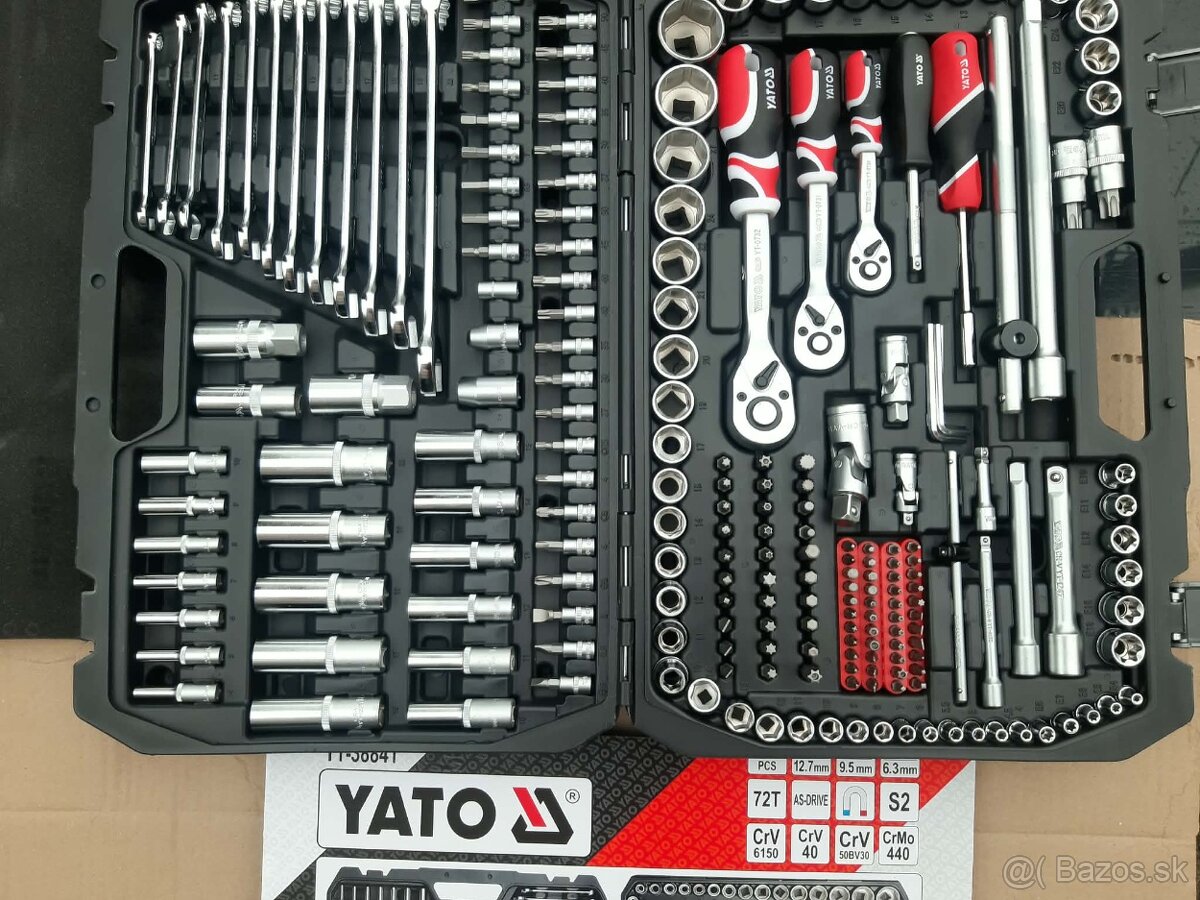 kvalitna gola sada Yato 216dielna kvalitna s troma račnami, nástavce, predlžovacie nástavce, kĺbové nadstavce očko ploché kľúče a ďalšie príslušenstvo. Vyrobené z kvalitnej chromvanadiové ocele.