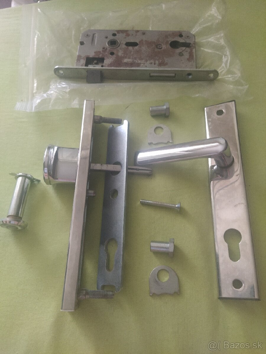 Má nové kovanie z jednej strany je guľa a na druhej strany je kľučka, má zámok aj bezpečnostný zámok s kľúčom.