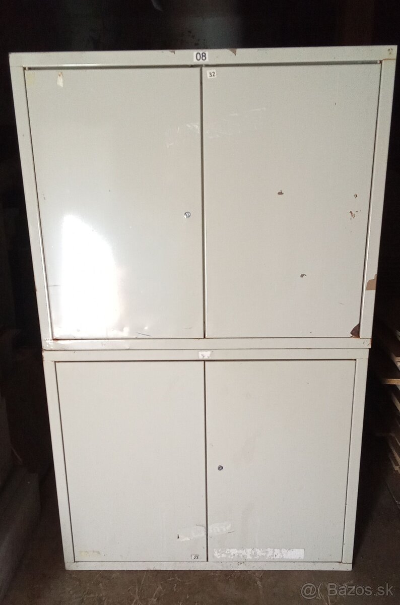 Predám staršie plechové skrinky (12 kusov). Rozmer V-83/Š-100/H-40 cm. Polica výškovo nastaviteľná. Nosnosť police 50kg. Cena 35€/kus bez zámku, 60€/kus uzamykatelna. Osobný odber cez víkend.