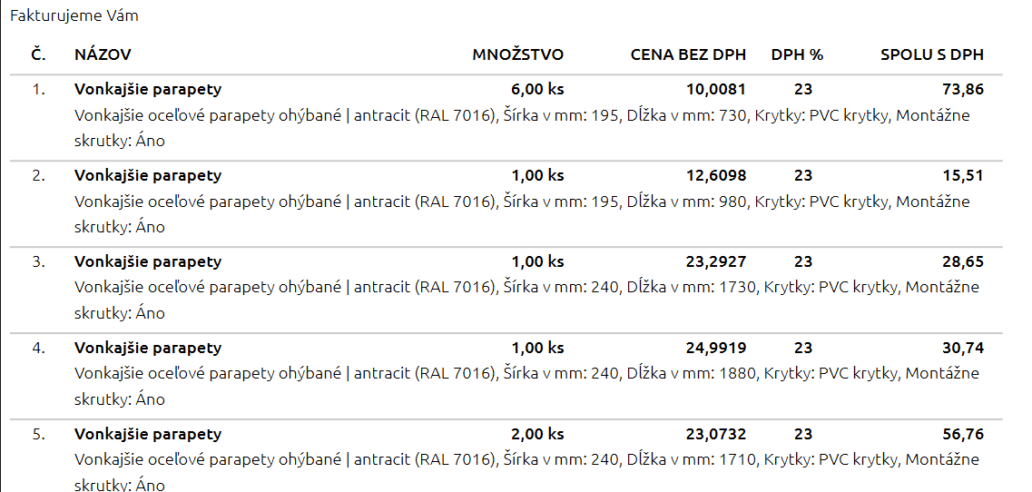 Vonkajšie parapety hliníkové - [8.3. 2026]Predám krátko používané nepoškodené kvalitné ťahanné hrubostenné hliníkové vonkajšie parapety.