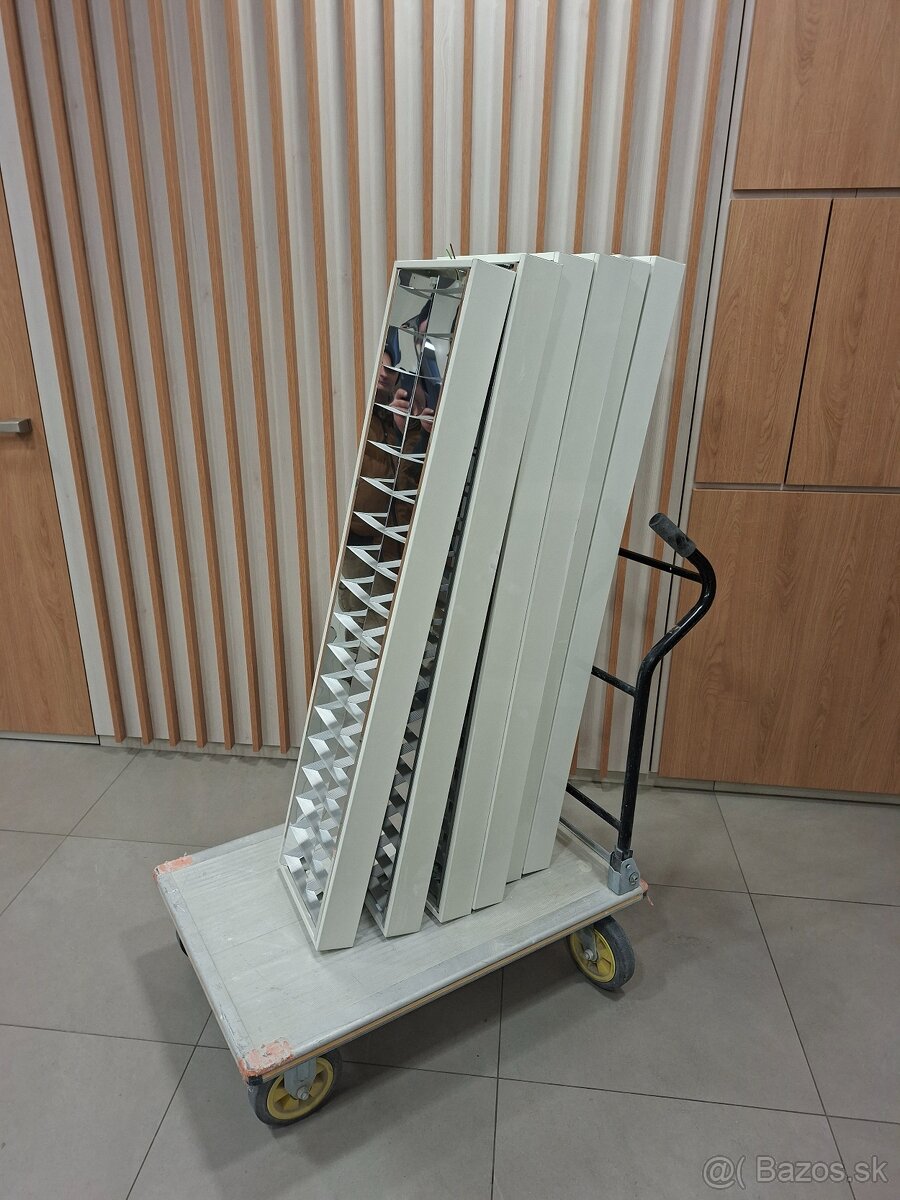 Predam 6 kusov funkcne kancelárske svietidla na 120 cm trubice vrátane trubic moznost prerobit aj na led z boku su vykruzene diery boli montované 2 vedľa seba cena za 6 ks spolu