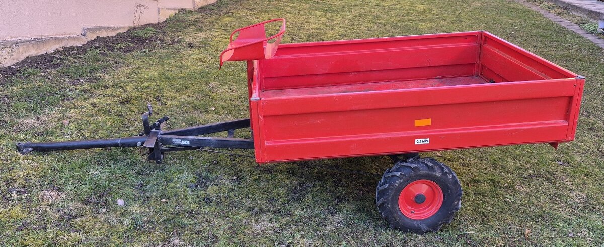Predám prívesný vozík PVT-400. Vozík je predurčený pre jednonápravové malotraktory Vari, Agzat, alebo Šupa. Je vybavený nožnou a parkovacou brzdou, sedadlom a vyklápacou korbou smerom dozadu. Spevnené 3 bočnice sú ľahko odnímateľné. Nosnosť vozíka je 400kg.