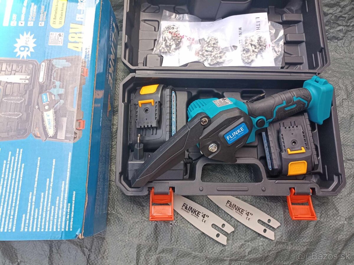 Ľahká baterková akumulátorová pílka s dvoma baterkami nabíjačka dve lišty a troma retiazkami.
