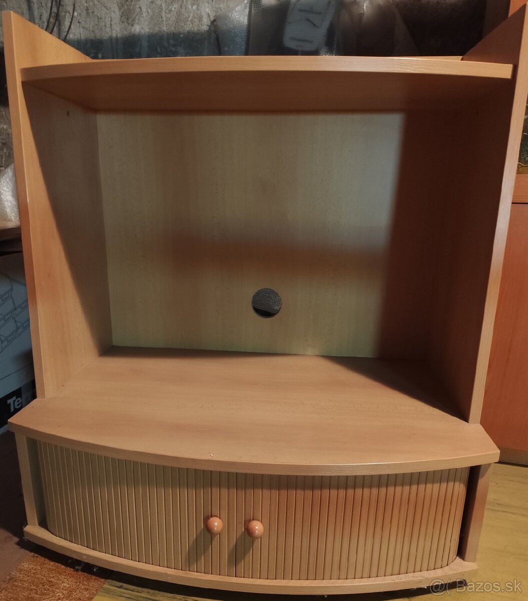 Skrinka šírka 90 cm, vnútorný rozmer 85 cm, hore polica hĺbka 42,5 cm, dolná polica hĺbka 58 cm, výška odkladacie ho priestoru 22 cm, výška 101 cm. Farba buk.