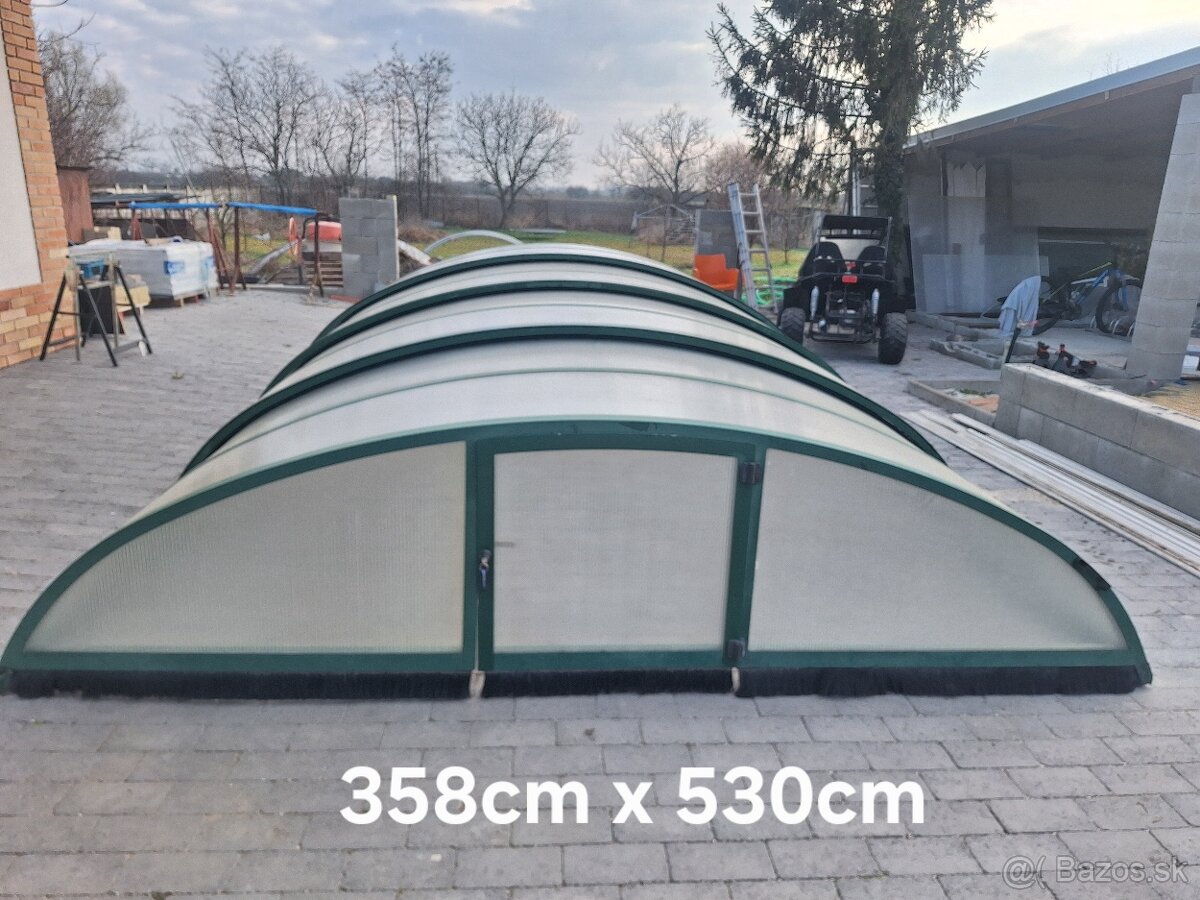 Predam zastresenie na bazen š.358cm dl.530cm 4 dielne v super stave,kolajnice dlhe,da sa zasunut za bazen. Idealne aj na kruhovy bazen. Ked sa zasunie za bazen ma len 140cm.