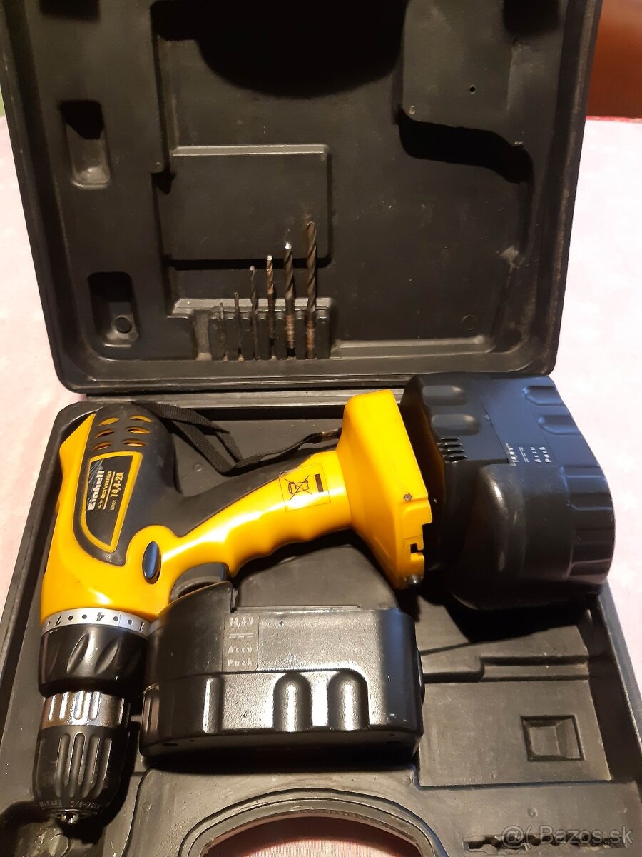 Predám používaný aku skrutkovač EINHELL - 14,4V, 2A, s dvomi batériami, ktoré sú nefunkčné a nabíjačkou v originálnom balení - v kufríku. Chýba transformátor k nabíjačke. Predáva sa ako zobrazené na priložených fotografiách. Možnosť zaslania na dobierku s príplatkom za poštovné.