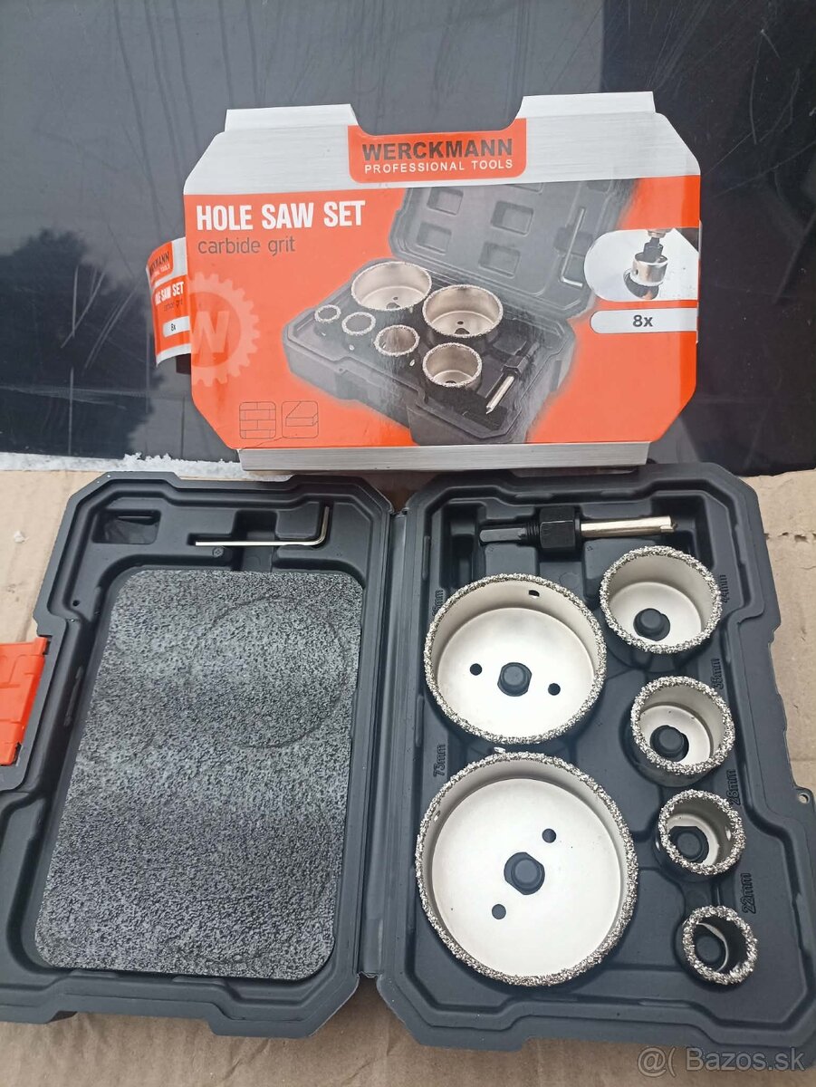 Korunka vykružovacia 8dielna diamantová sada vyrezavač s karbidovým ostrím pre čisté a presné vŕtanie keramických obkladov a dlaždíc. Univerzálny unášač pre korunkové vrtáky, špeciálny vodiaci vrták.