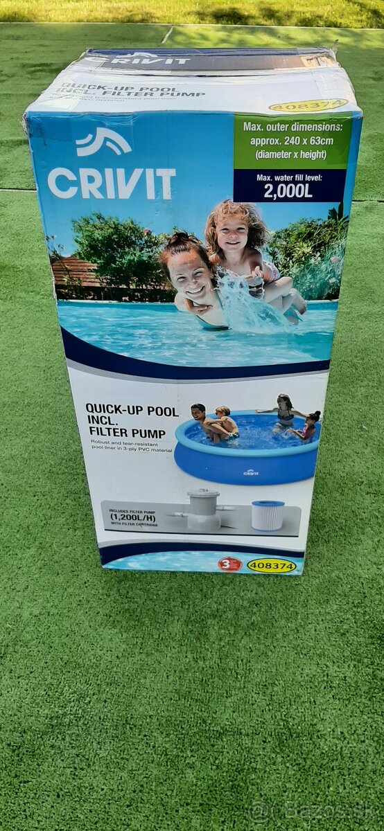 Predám úplne nový, nevybalený bazén Crivit s filtraciou. Popis bazéna: priemer 240cm, výška 63cm, objem 2000 l, vrátane filtračného čerpadla s kartušou. Rýchle a jednoduché "samočinné" postavenie bazén-viď. návod. Vhodné pre deti-za málo vody, veľa muziky :-). Viem poslať aj kuriérom- Slovensko.