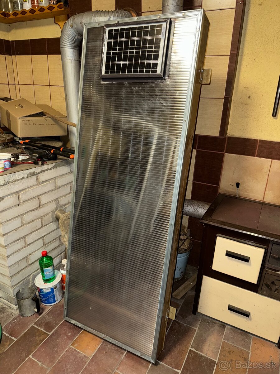 Predam doma robený teplovzdusny panel so solárnym ventilátorom , solárny panel sa ohrieva od slnka a následne teplým vzduchom vykuruje miestnosť ,vzduch je ohriatí oproti vchadzajucemu o 40*C , sol.panel je profesionálny len vyskúšaný . Rozmery je š. 65 cm x v. 175cm x hr. 13 cm prieduchy majú rozmer 10cm , dohoda možná