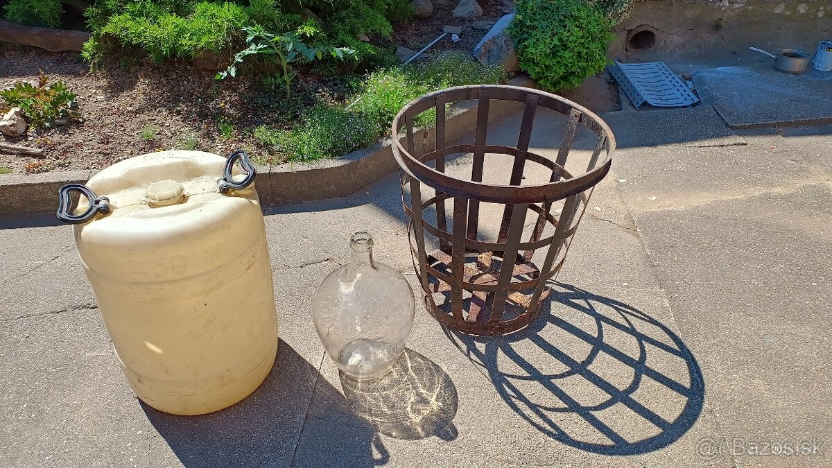 Predám sklenené demižóny 20L(15€) ,15L(12€), 10(7€) L, plastové bandasky 50L(15€), železný kôš na 58 L(15€) demižón.