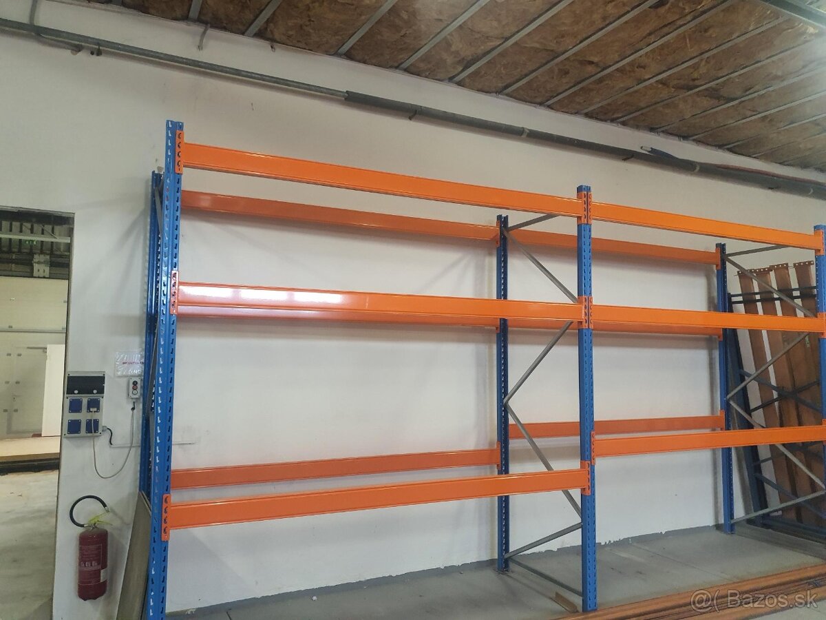 Predám väčšie množstvo paletových regálov PROMAN s nosníkmi na tri palety: Dĺžka 2700mm výška 110mm hrúbka 50mm nosnosť 2800kg.