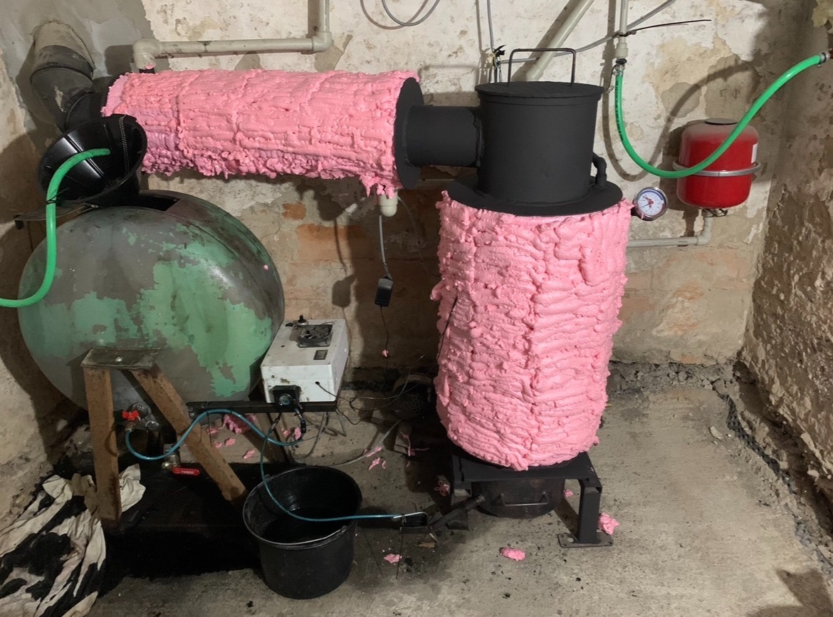 Predam kotol na olej, vodnik, spolu s nadržou na olej a kominovym vymenikom.