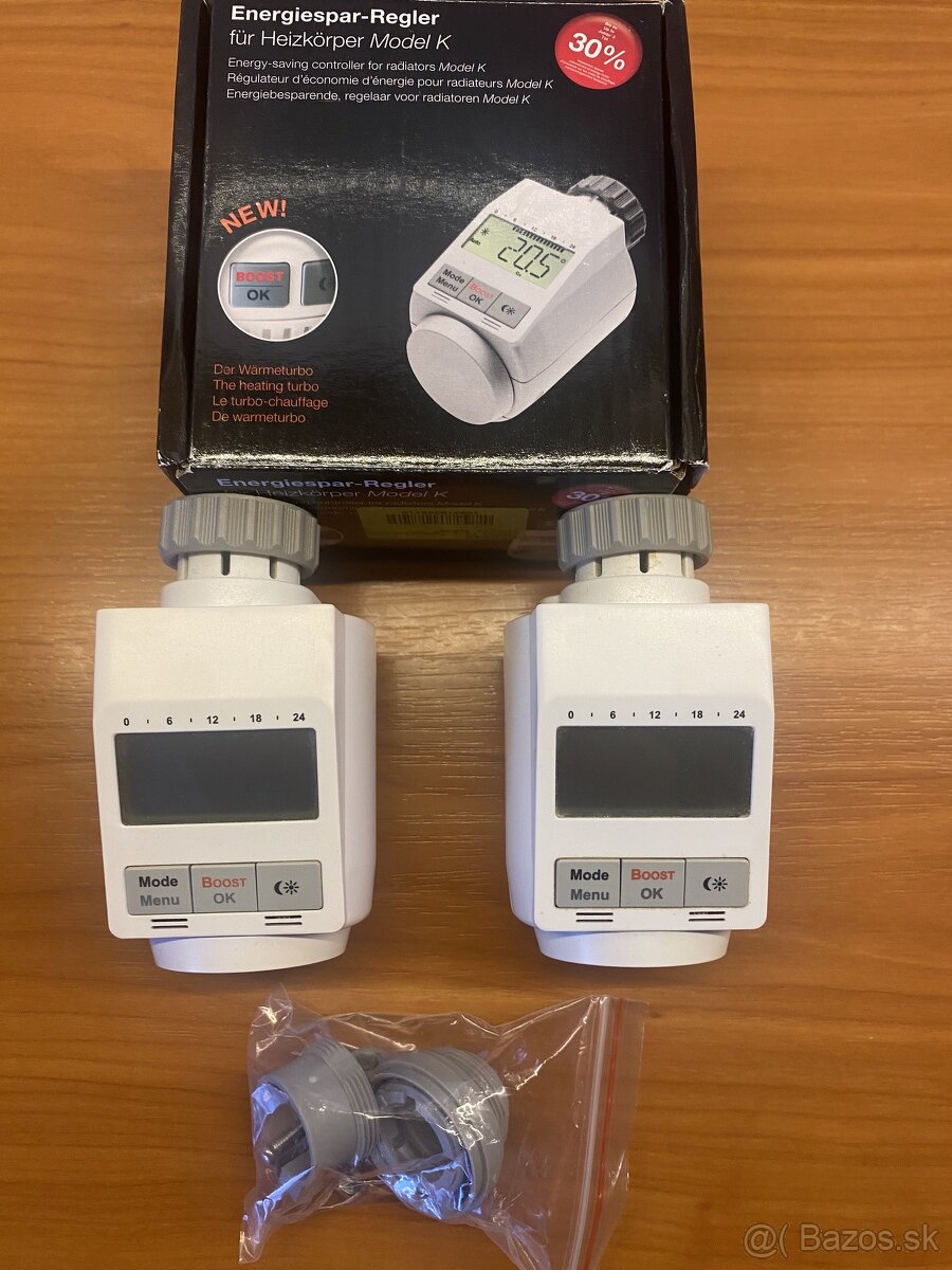 Predám 2ks. používané, elektronické termostatické hlavice eQ-3, komplet s príslušenstvom a návodom. Hlavica je kompatibilná s väčšinou ventilov s pripojením M30x1,5. 9€/ks
