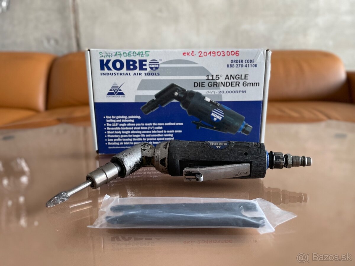 Predám používanú profesionálnu pneumatickú uhlovú brúsku značky KOBE. K brúske je kužeľová frézka a vidlicové kľúče.