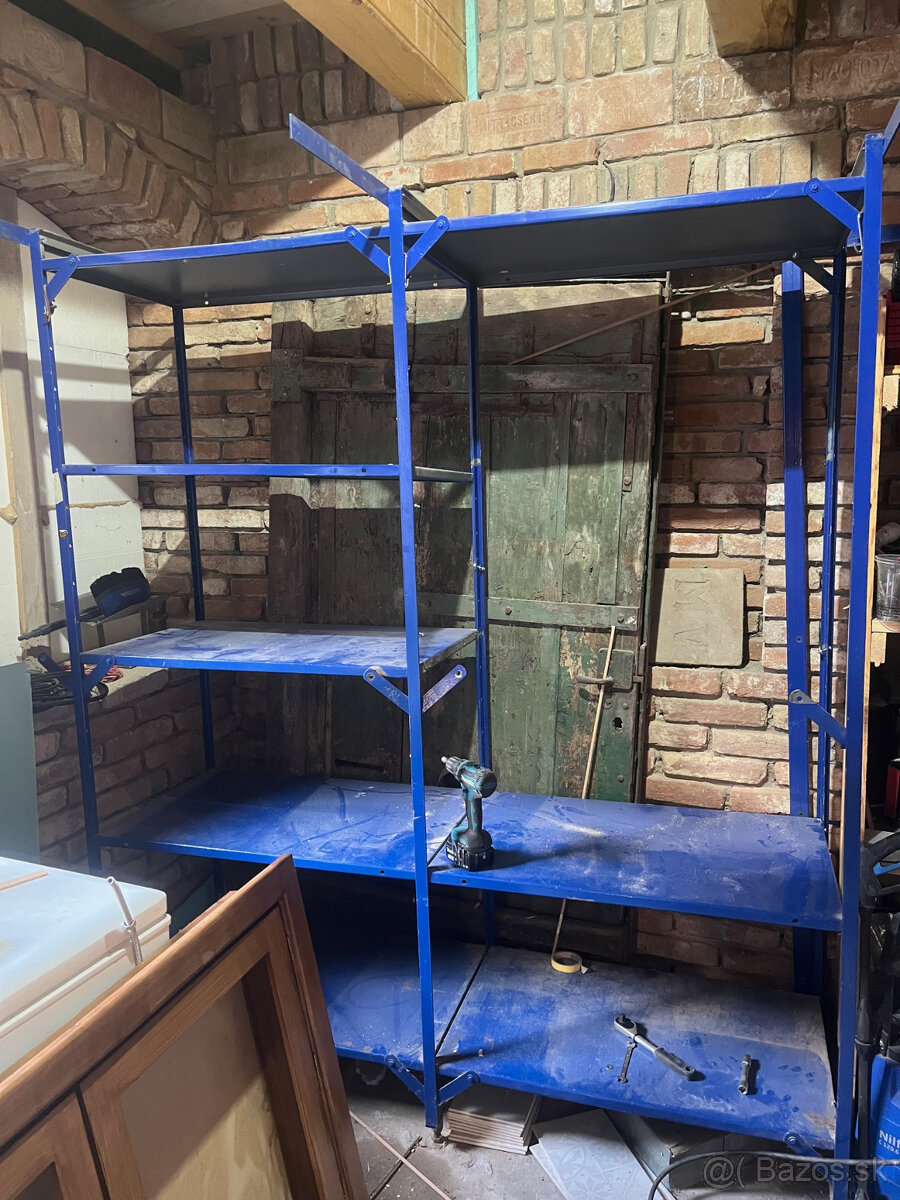 Má 10 železných políc, ktoré sa dajú rôzne nastaviť. Regál je rozobraný: 10 políc a 3 stojky. Na fotke sú už dve police zdemontované.