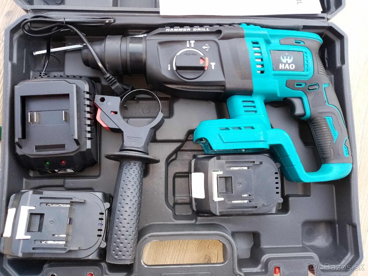 priklepove akumulatorove baterkove vŕtacie kladivo na vŕtanie s príklepom bez priklepu sekanie, dve baterky a nabijačka.