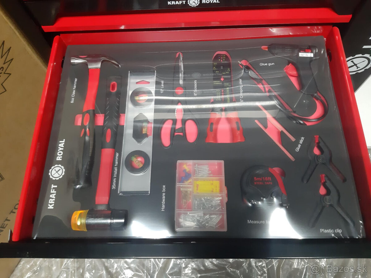 uzamykateľný pojazdný montážny vozík na náradie na kolieskach, pojazdný box so 7zásuvkami, 6 zasuviek s naradím.na boku uzamykacia skrinka, odkladacia stolová časť.