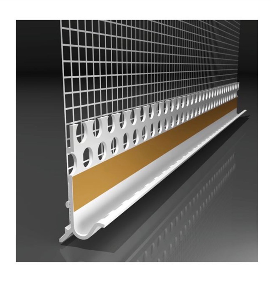 PVC Okapnica soklov s tkaninou umožňuje dokonalé zakončenie omietky v spodnej časti kontaktného zatepľovacieho systému.