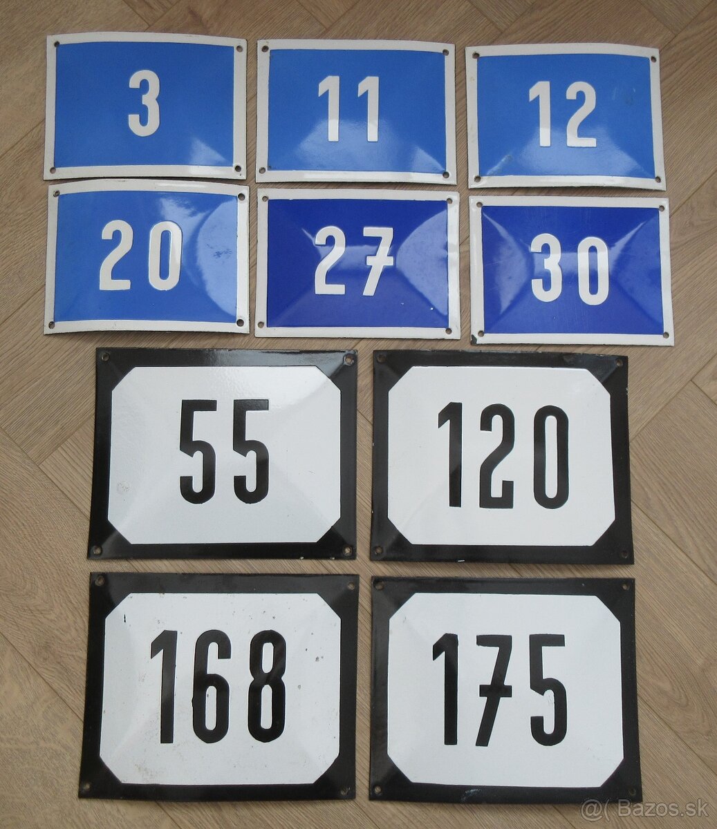 Predám staré smaltované tabuľky - súpisné čísla domov.Každá stará smaltovaná tabuľka je vo veľmi zachovalom stave.Rozmery modrobielych tabuliek sú 20 x 15 cm.Vek modrobielych tabuliek odhadujem na 80 rokov.Rozmery bieločiernych tabuliek sú: 24,7 x 20 cm.Smaltovaná tabuľa vhodná na starý dom, chatu , chatku, chalupu alebo do zbierky pre zberateľa.