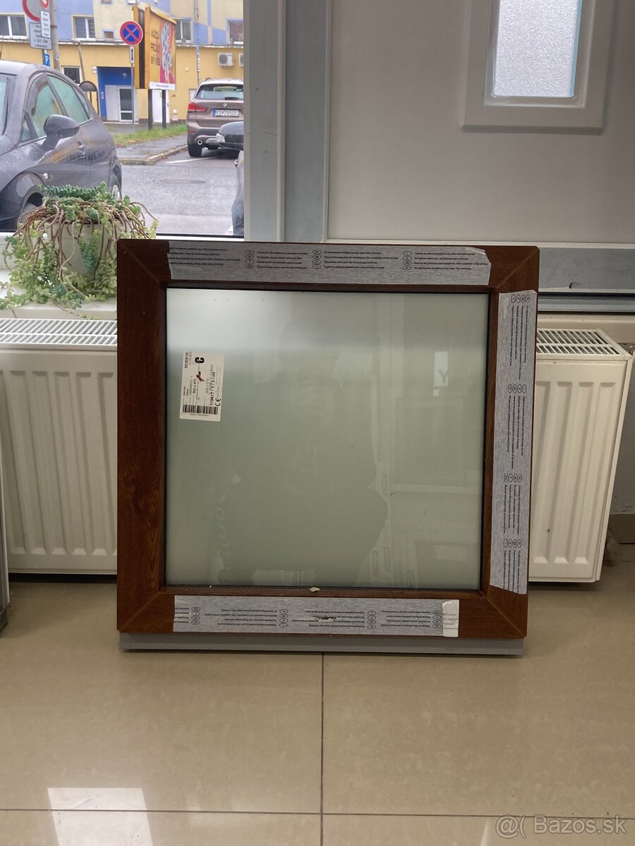 Ponúkam na predaj nové plastové fixné okno s mliečnym sklom v rozmere 600x570mm zvonku zlatý dub zvnútra biele.