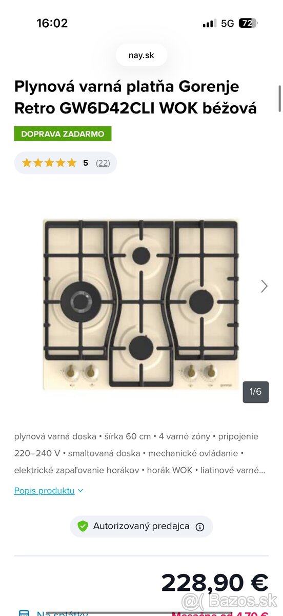 Predám plynovú varenú dosku Gorenje GW6D41CLI. Varná doska je úplne nová, nepoužitá a nikdy nenamontovaná. Plná záruka 2 roky. Kúpená 27.3.2026