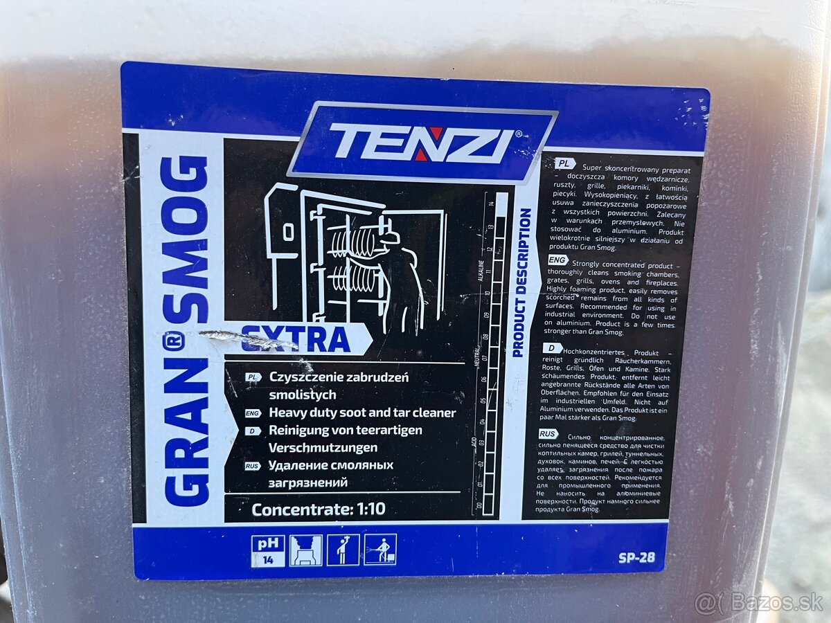 Predam čistič na udiarne, grily, krby, pece, kachle, sporáky a rôzne rošty, ale aj komíny na odvod dymu. Čistič Tenzi Gran Smog EXTRA odstráni aj silné vrstvy starého znečistenia zo všetkých strojov a zariadení, kde účinkuje oheň a dym. Účinne odstraňuje znečistenie dechtom a zanecháva povrch čistý a lesklý. Je vysoko peniaci a dokáže odstrániť aj kontamináciu ohňom zo všetkých povrchov. Zostalo mi s 10l ešte 6l čističa. Čistič stoji 12€ za liter a moja cena je 8€ za liter. Inzerat plati do zmazania.