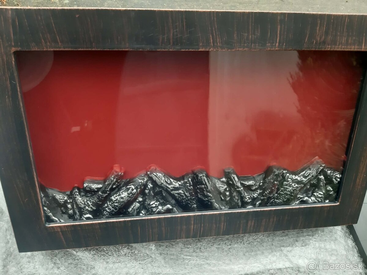 Elektricky, baterkovy krb s LED plameňmi 95x28x10cm, 60x36cm. Svetelná dekorácia žeravé uhlíky a imitáciu polien za sklenenou stenou osvetľuje s efektom blikajúceho ohňa.