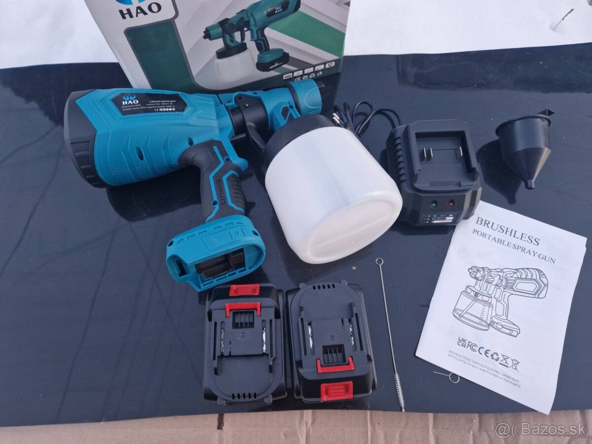 Aku baterkova vzduchovú striekacia pištoľ, plynulo nastaviteľnú reguláciu prietoku farby, možnosť nastavenia striekania na horizontálne, vertikálne, kruhové, dve baterky nabijačka.