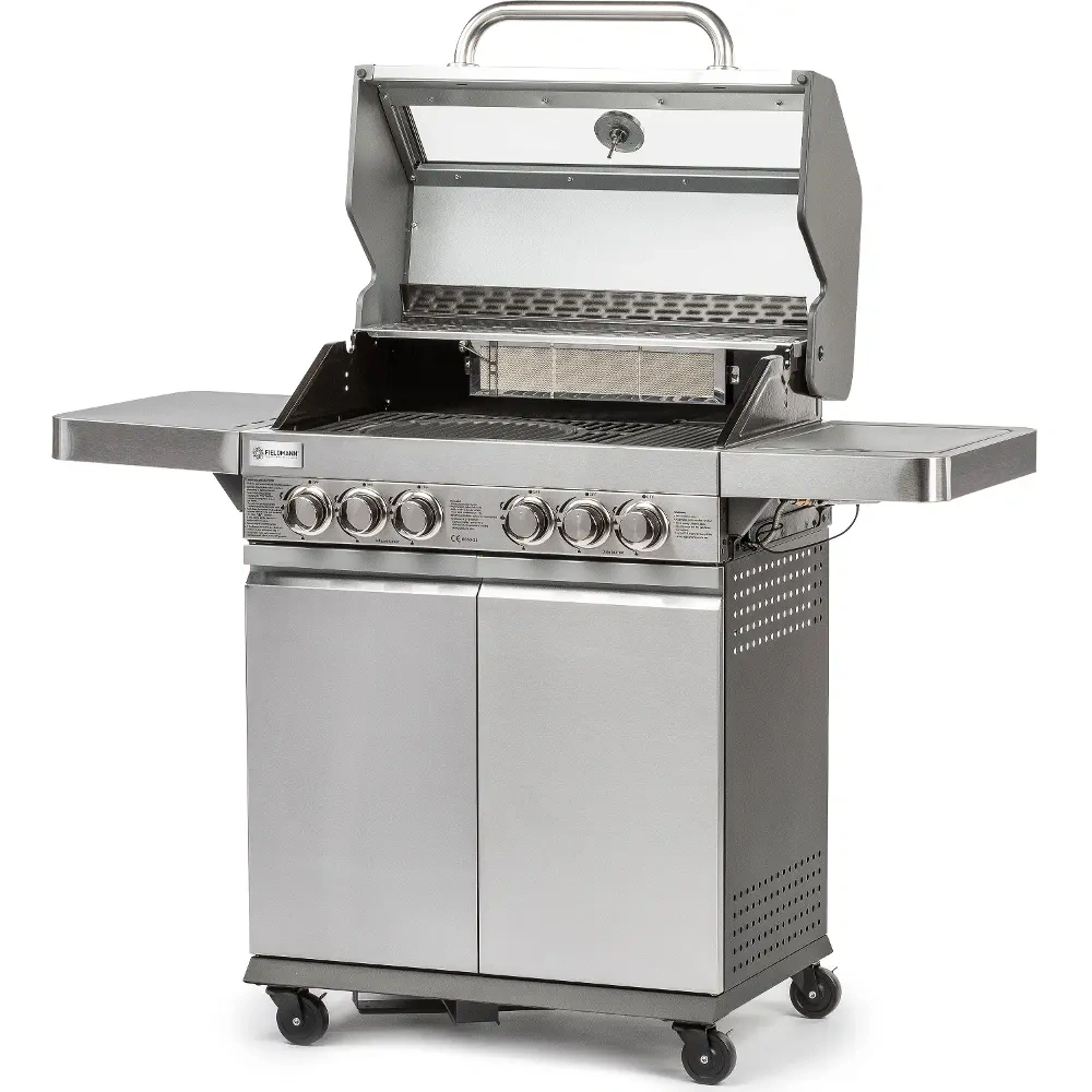Plynový gril, horáky hlavný 4x, bočný 1x, infračervený 1x, výkon horákov 18 kW, integrované zapaľovanie, grilovacia plocha 70 x 42 cm, liatinový rošt, teplomer,Pôvodná cena 549,-