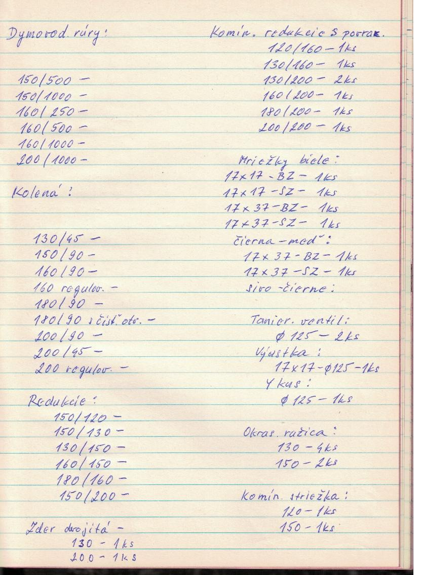 Dobrý deň. Predám dymovody, kolená, redukcie a podobné - zostatok zo zatvorenej prevádzky. Všetko nové - zoznam na obrázku.