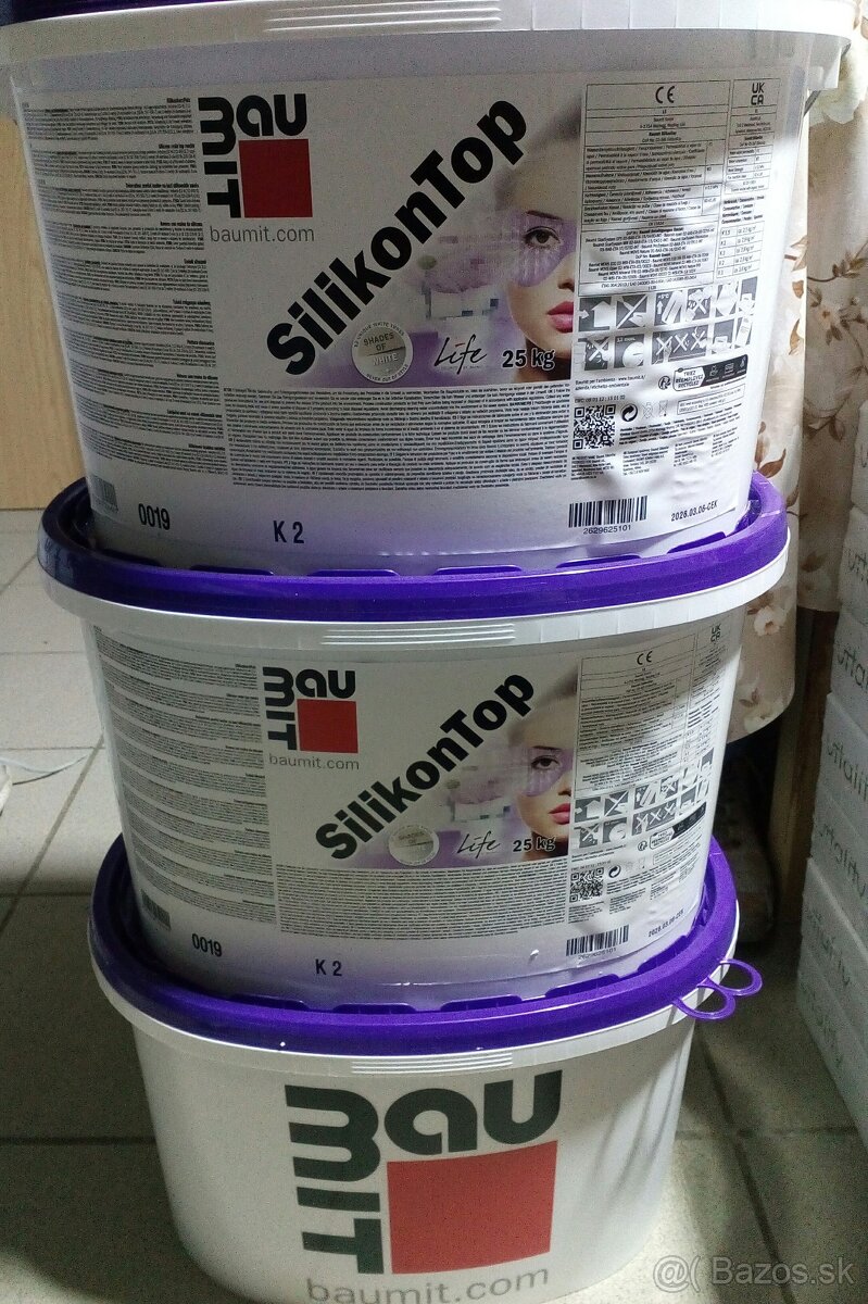 Predám bielu silikónovú fasádnu omietku baumit silikontop o hrúbke 2 mm. Mám 3 vedrá. 1 vedro 25 euro.