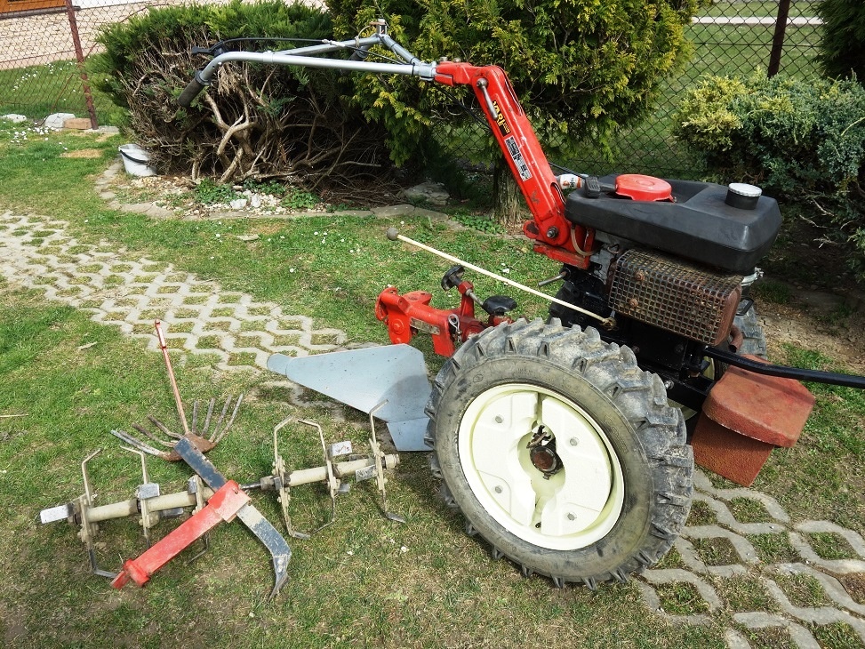 Predám vari systém s príslušenstvom. Prevodovka typ T-20 ( dve rýchlosti vpred + spiatočka), spojka 80 mm, šípové kolesá s vonkajšími aj vnútornými závažiami, dvojtaktný motor Jikov s obsahom 133 cm3 a výkonom 5,5 koní je v plne funkčnom stave. Je ku tomu pluh na orbu s nastavovacím telesom, rotavátor s brzdiacou radličkou a vyorávací pluh na zemiaky. Všetko môžeme odskúšať. Cena je 850,-€.