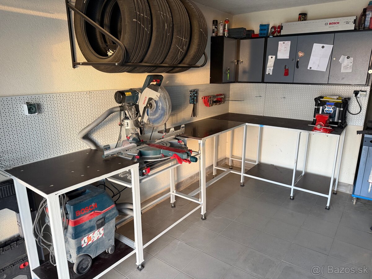 Predam pracovný ponk bez píly a zveráku.Stôl je nerozobersteľny a je predpríprava na pokosovu pílu kde sa dá nastaviť výška.Rozmery 166x320x62 cm a otvor pre pokosovú pílu je 85cm
