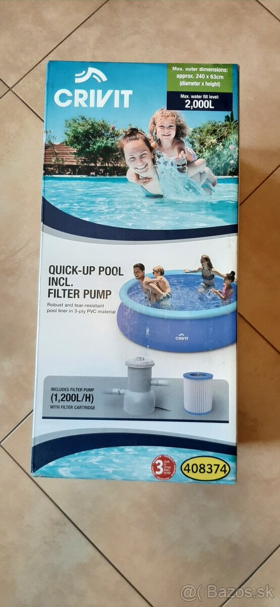 priemer 240cm, výška 63cm, objem 2000 l, vrátane filtračného čerpadla s kartušou. Rýchle a jednoduché "samočinné" postavenie bazén-viď. návod. Vhodné pre deti-za málo vody, veľa muziky :-). Viem poslať aj kuriérom- Slovensko.